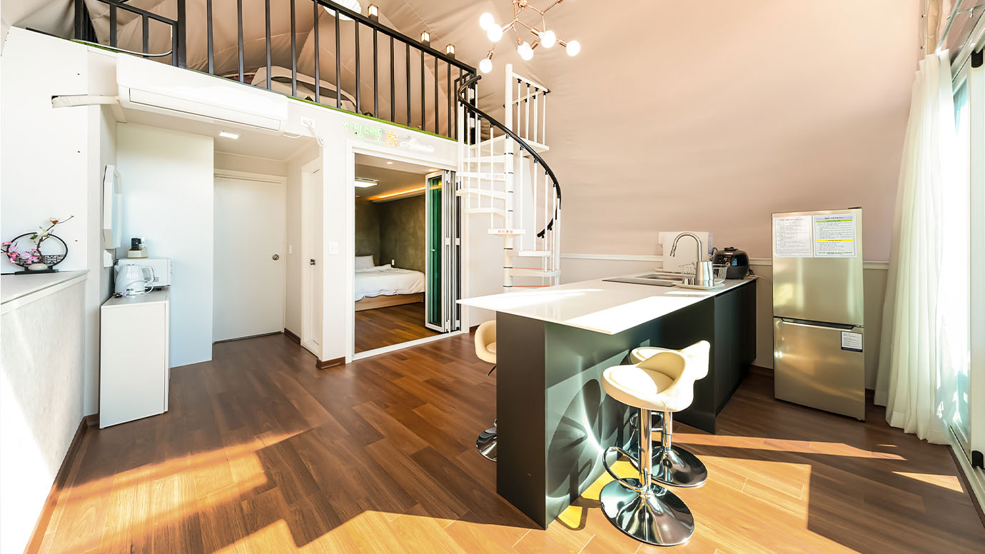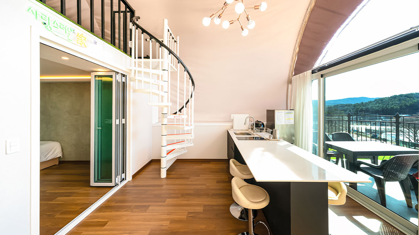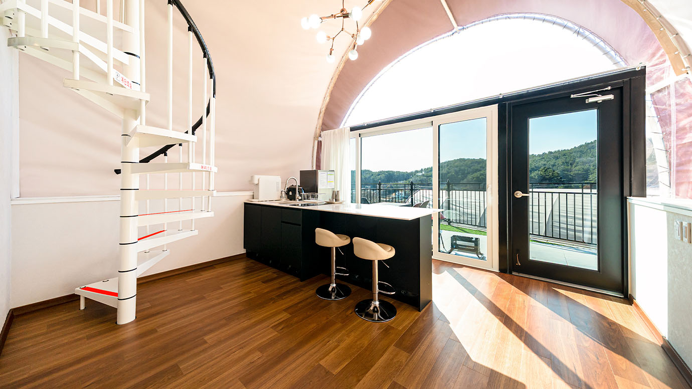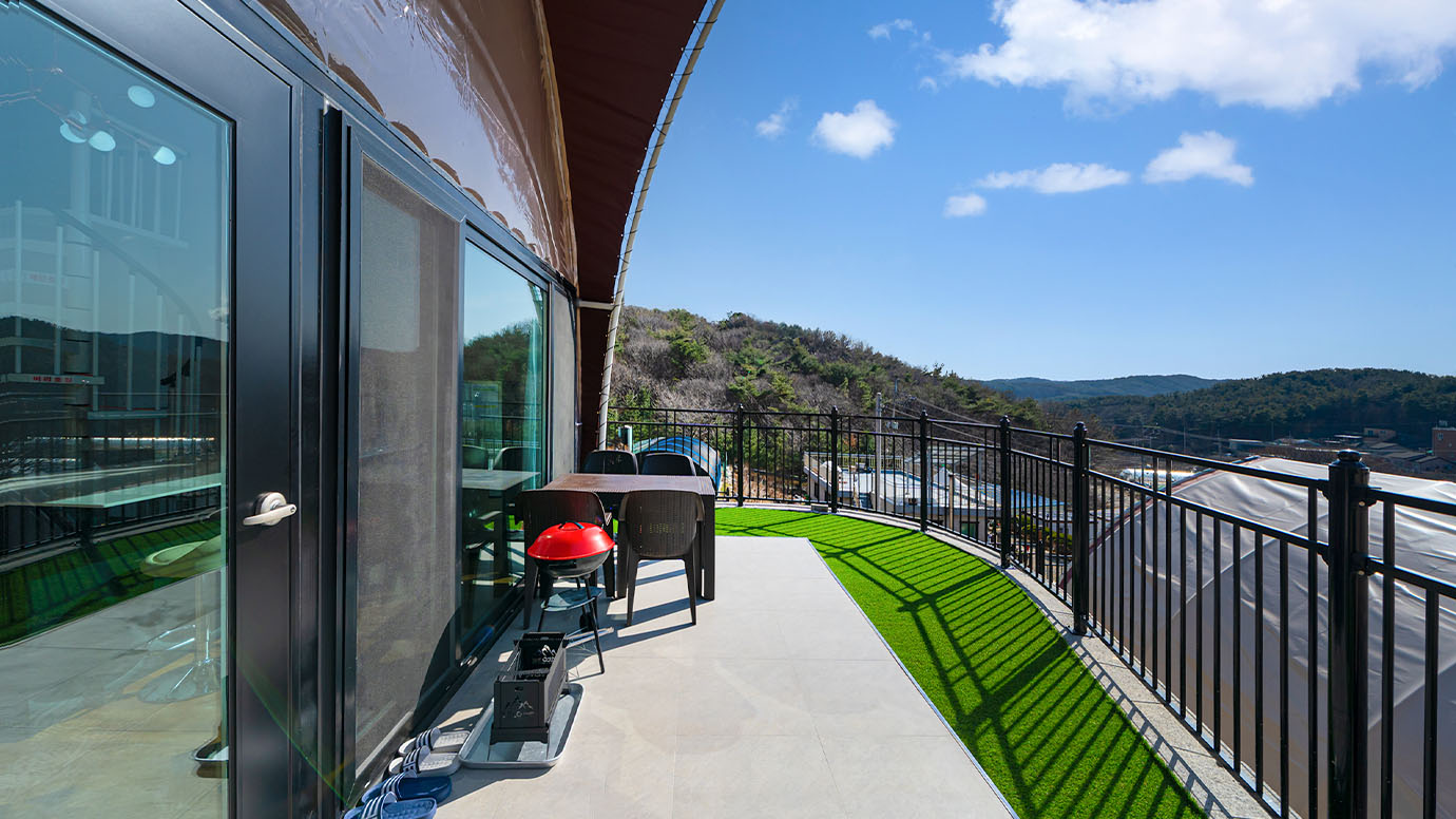 탁 트인 전망 속에서 여유로운 휴식을 즐기는 프리미엄 복층 글램핑 공간입니다.