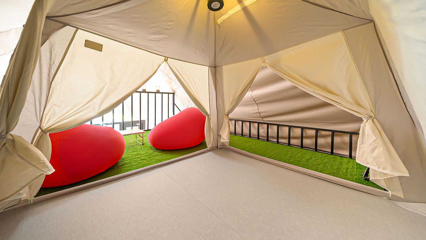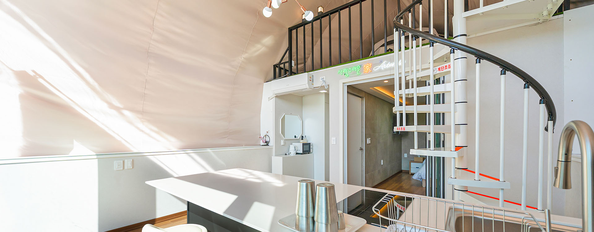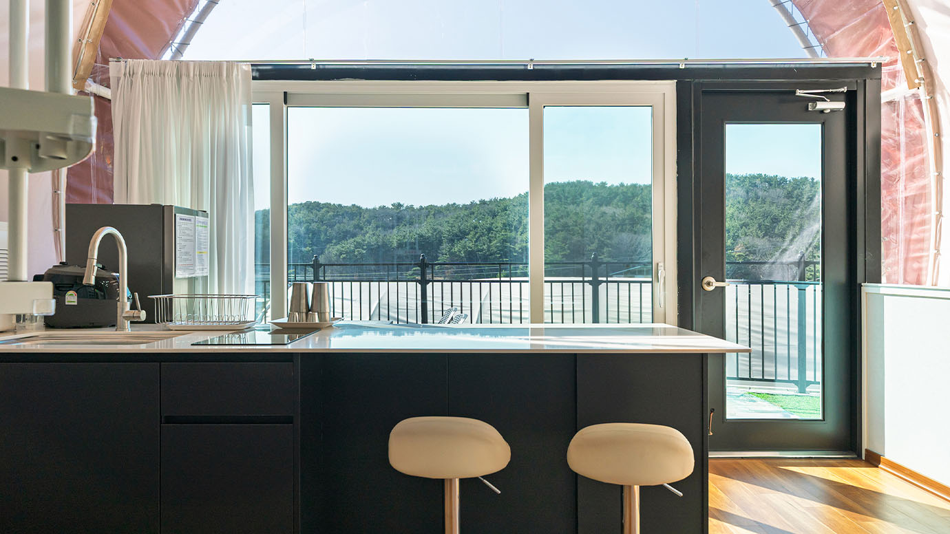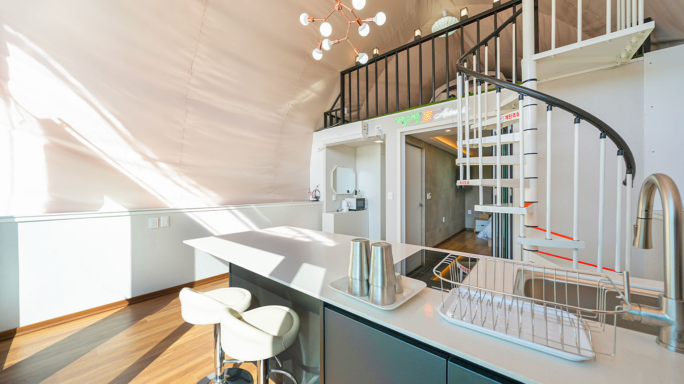 탁 트인 전망 속에서 여유로운 휴식을 즐기는 프리미엄 복층 글램핑 공간입니다.