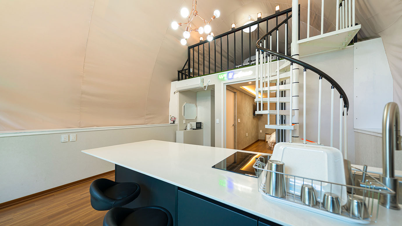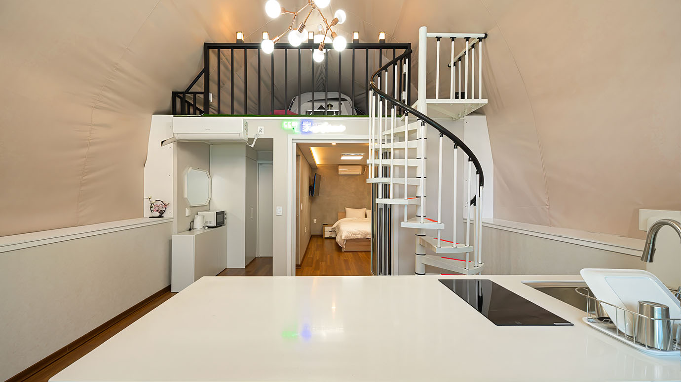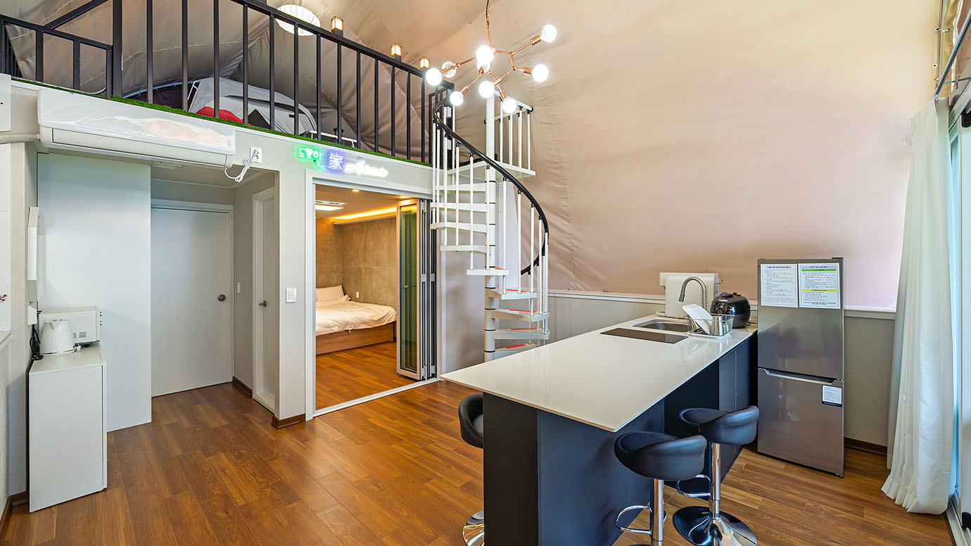 탁 트인 전망 속에서 여유로운 휴식을 즐기는 프리미엄 복층 글램핑 공간입니다.