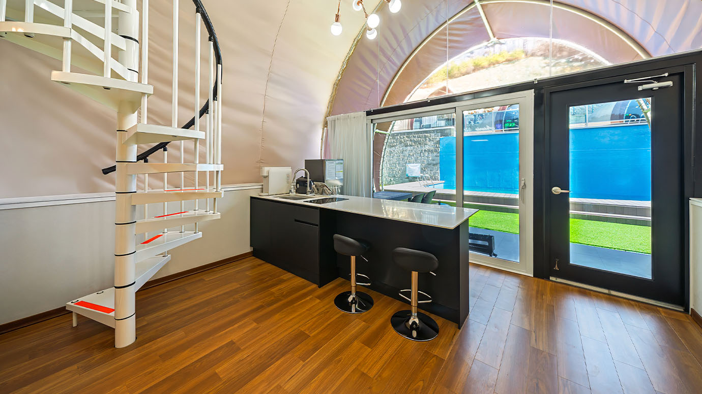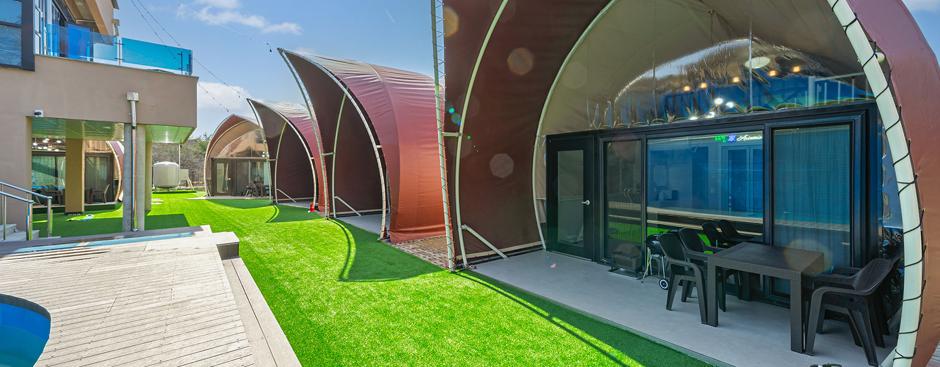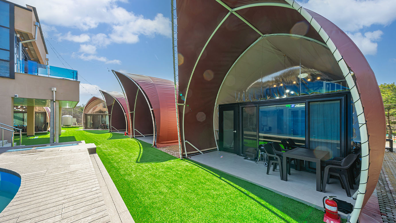 탁 트인 전망 속에서 여유로운 휴식을 즐기는 프리미엄 복층 글램핑 공간입니다.