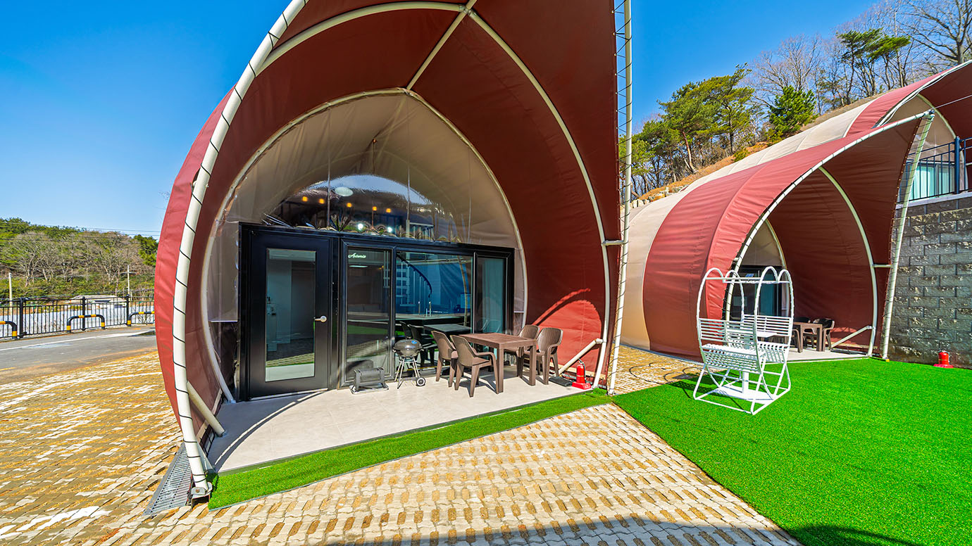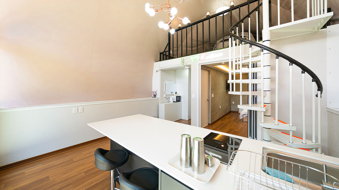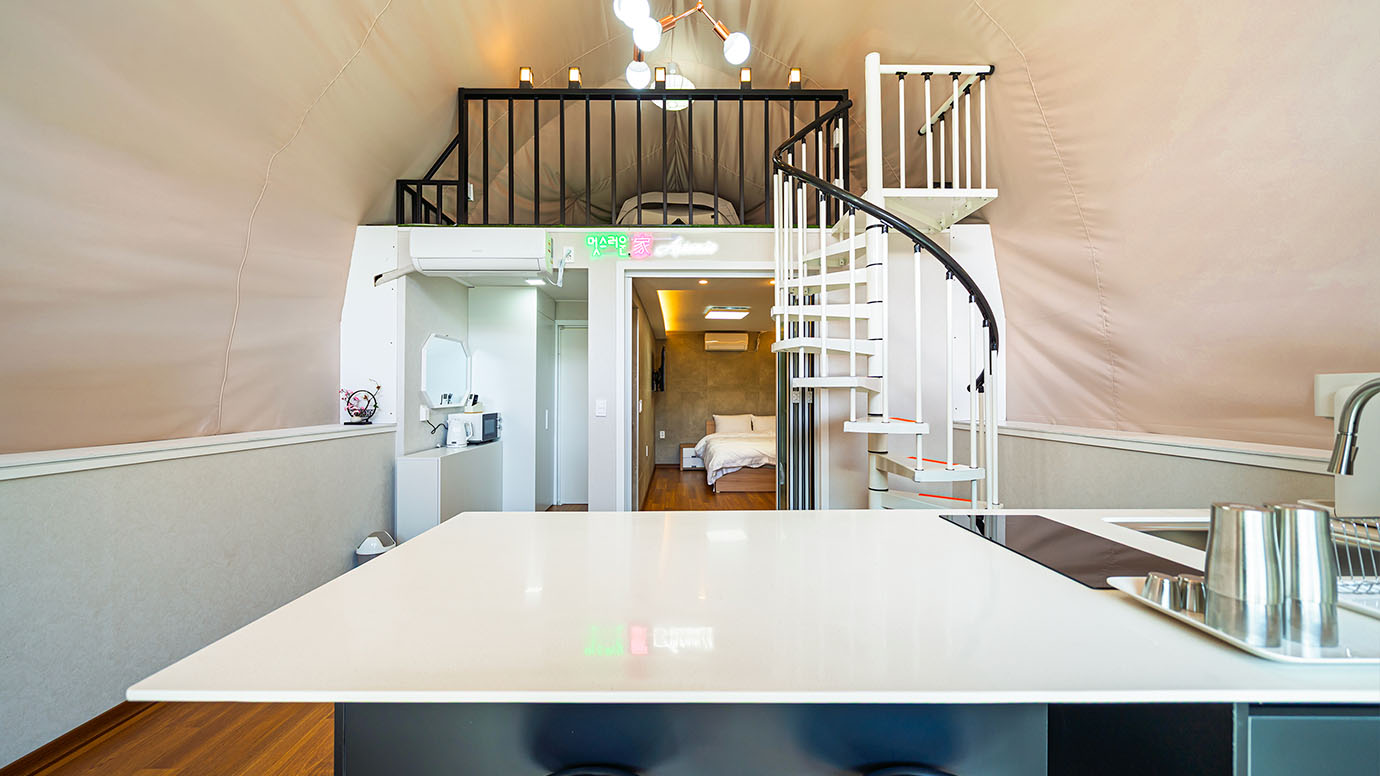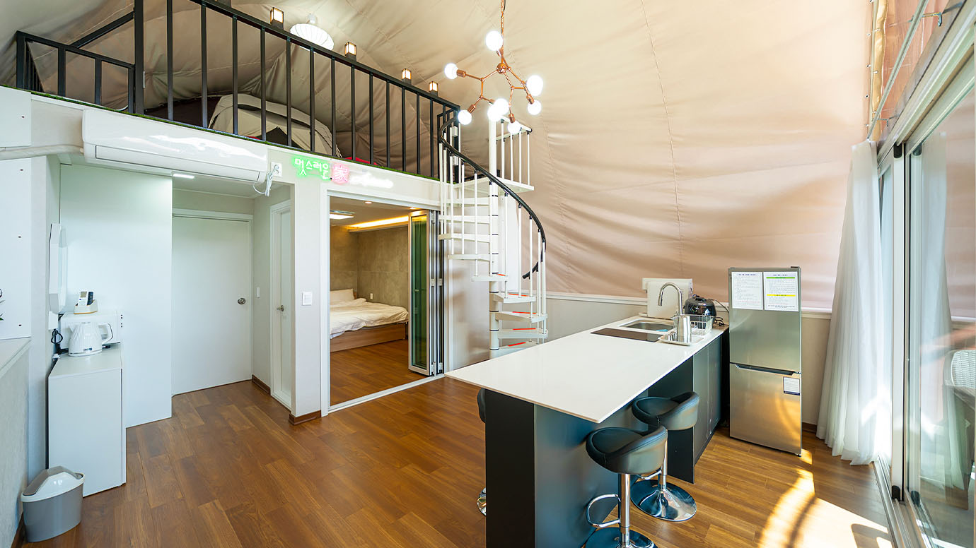 탁 트인 전망 속에서 여유로운 휴식을 즐기는 프리미엄 복층 글램핑 공간입니다.