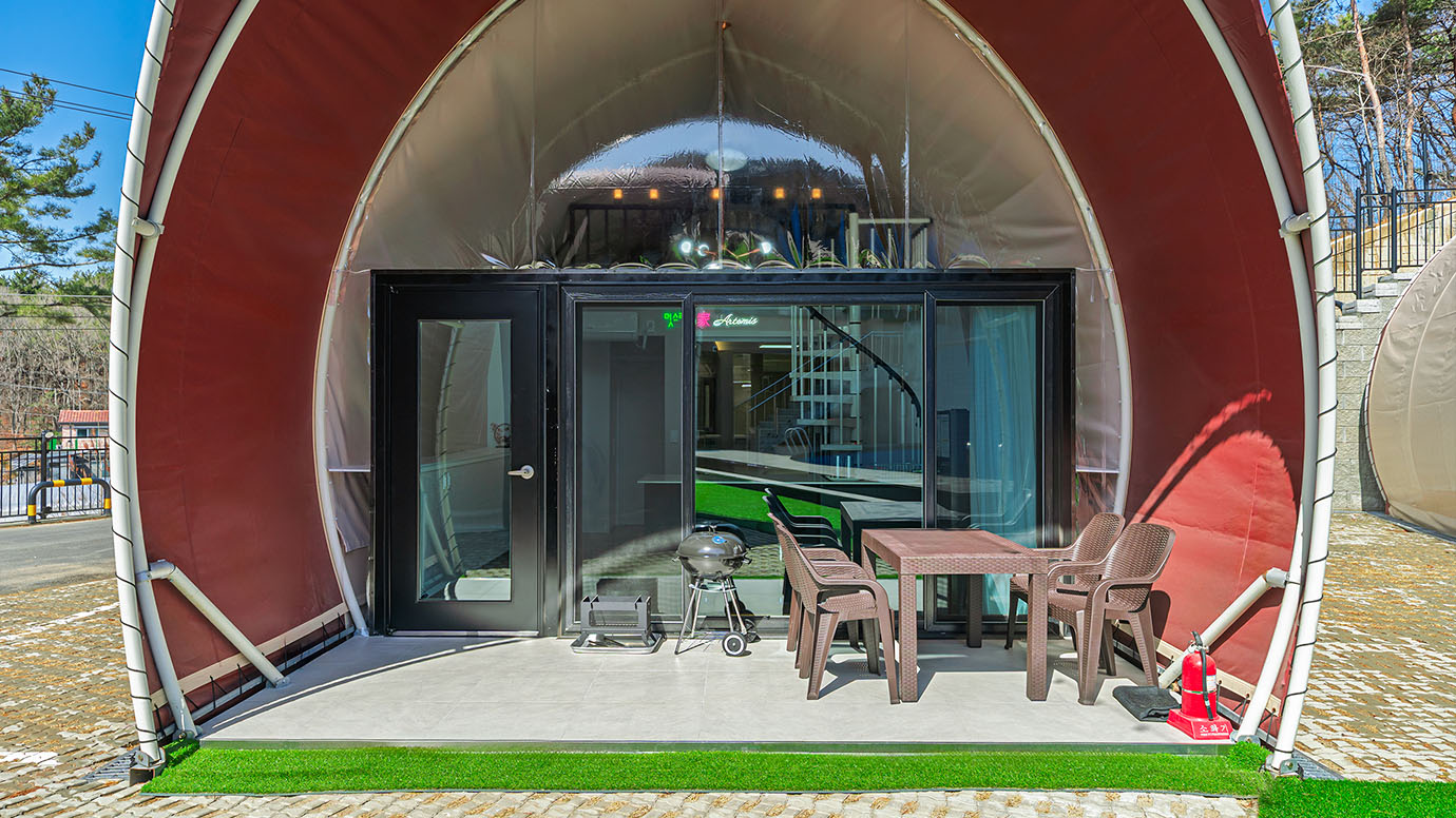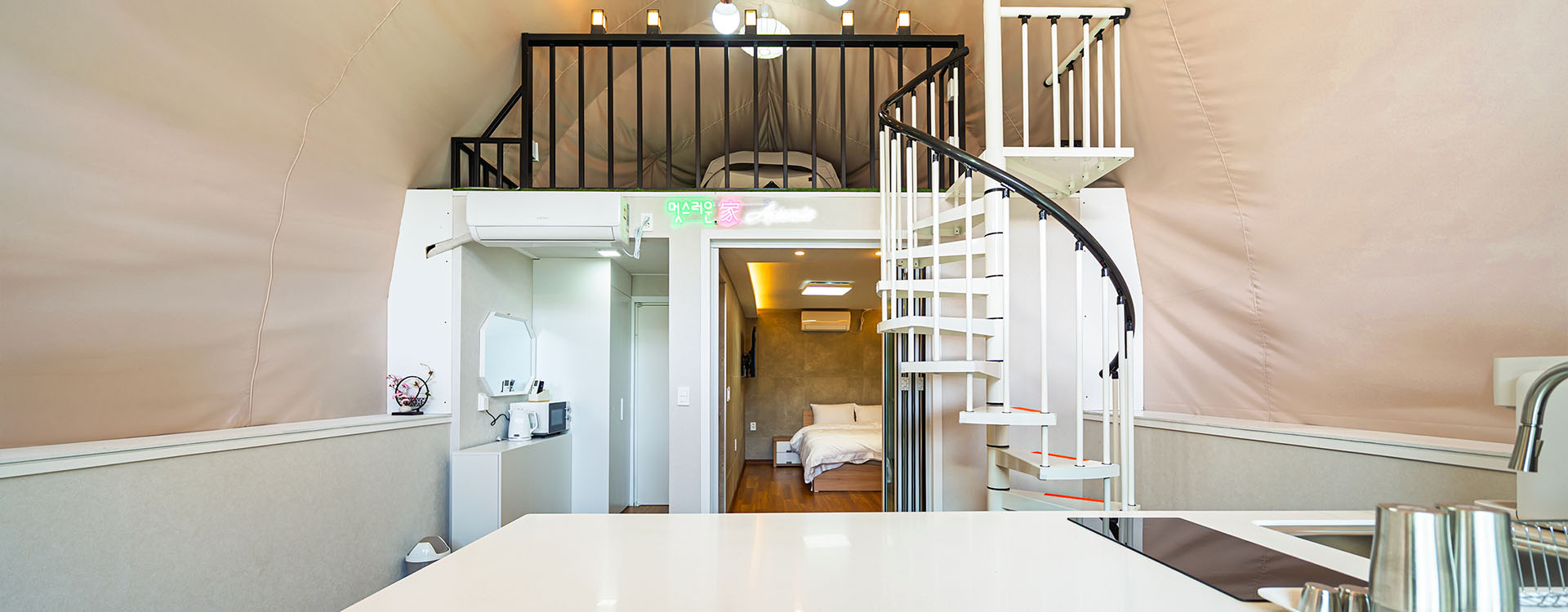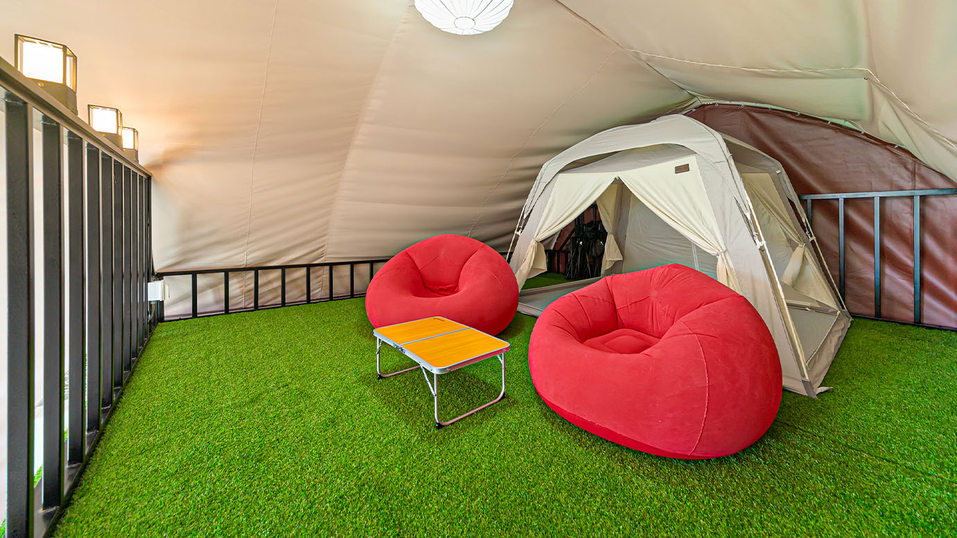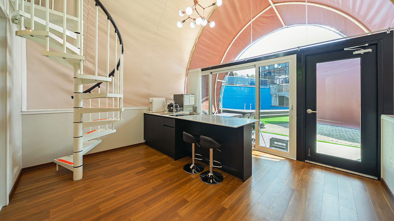 탁 트인 전망 속에서 여유로운 휴식을 즐기는 프리미엄 복층 글램핑 공간입니다.