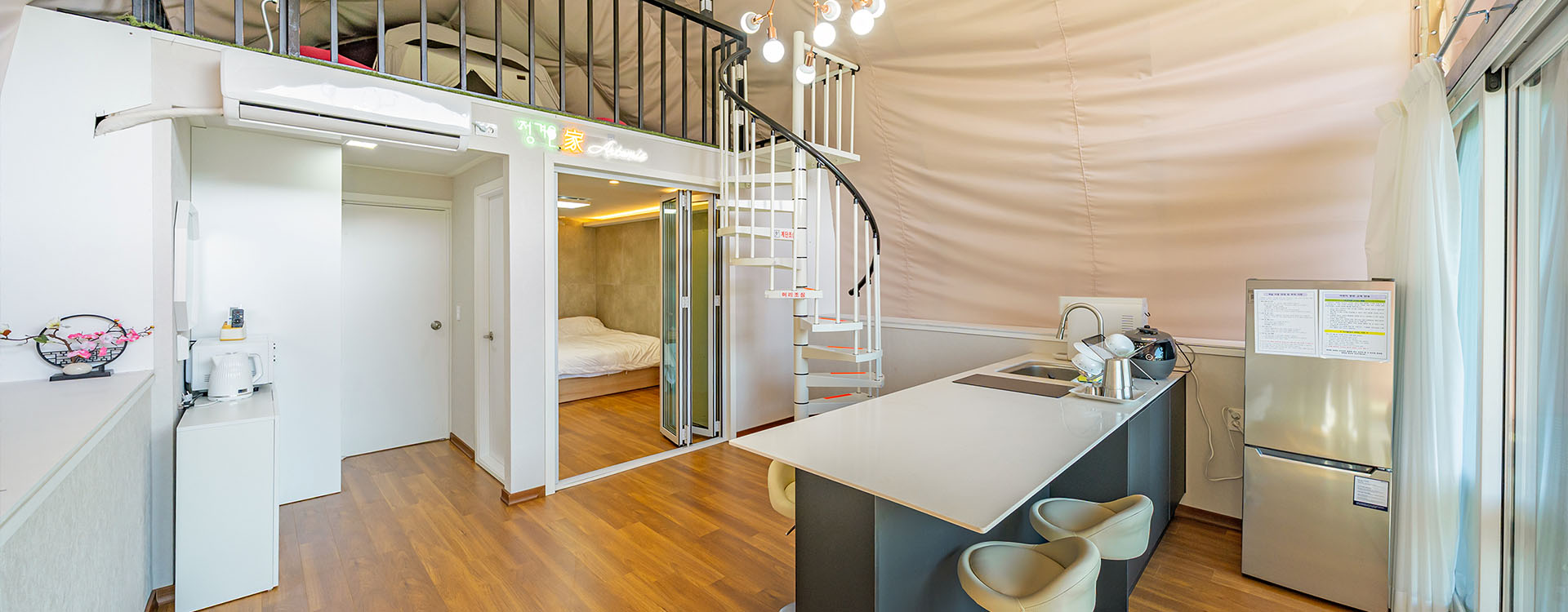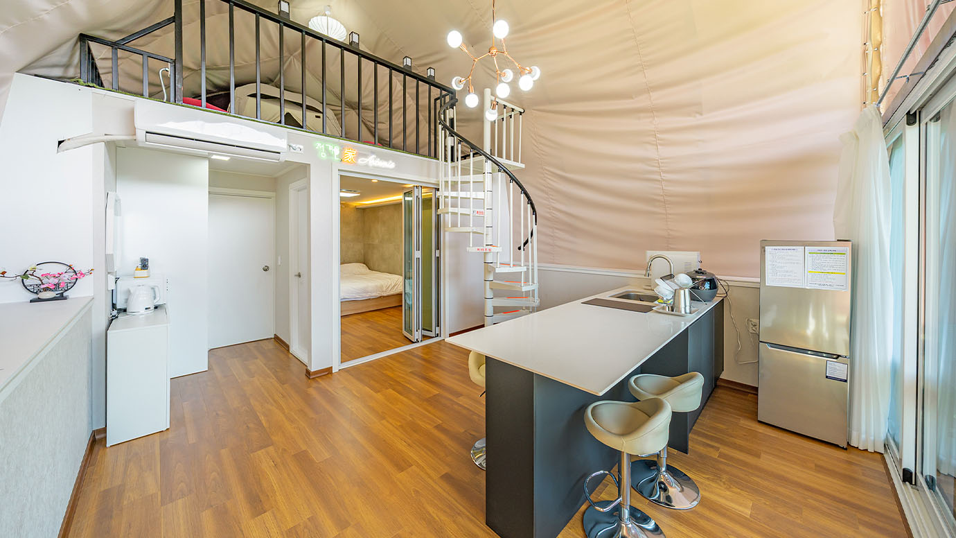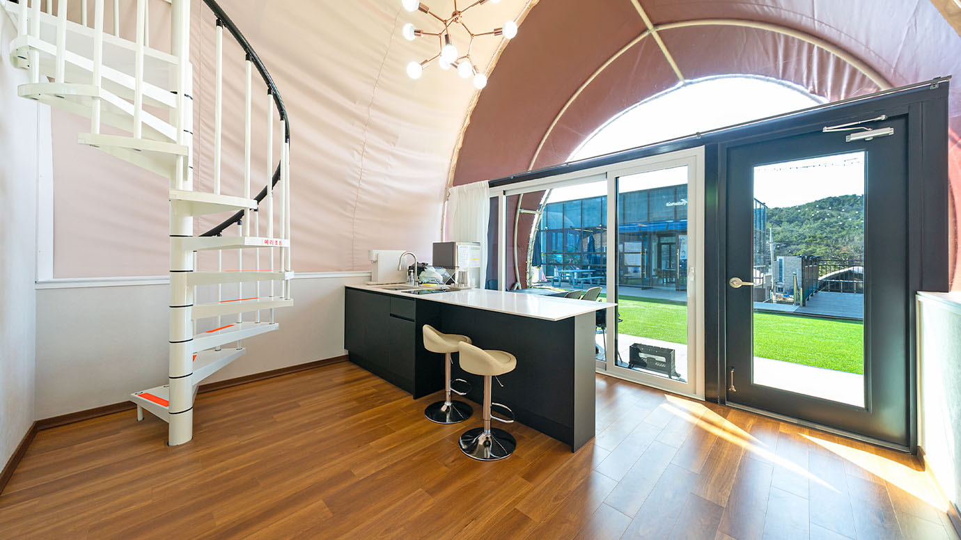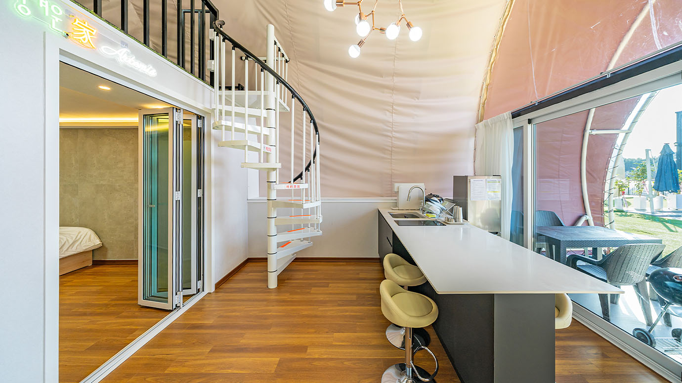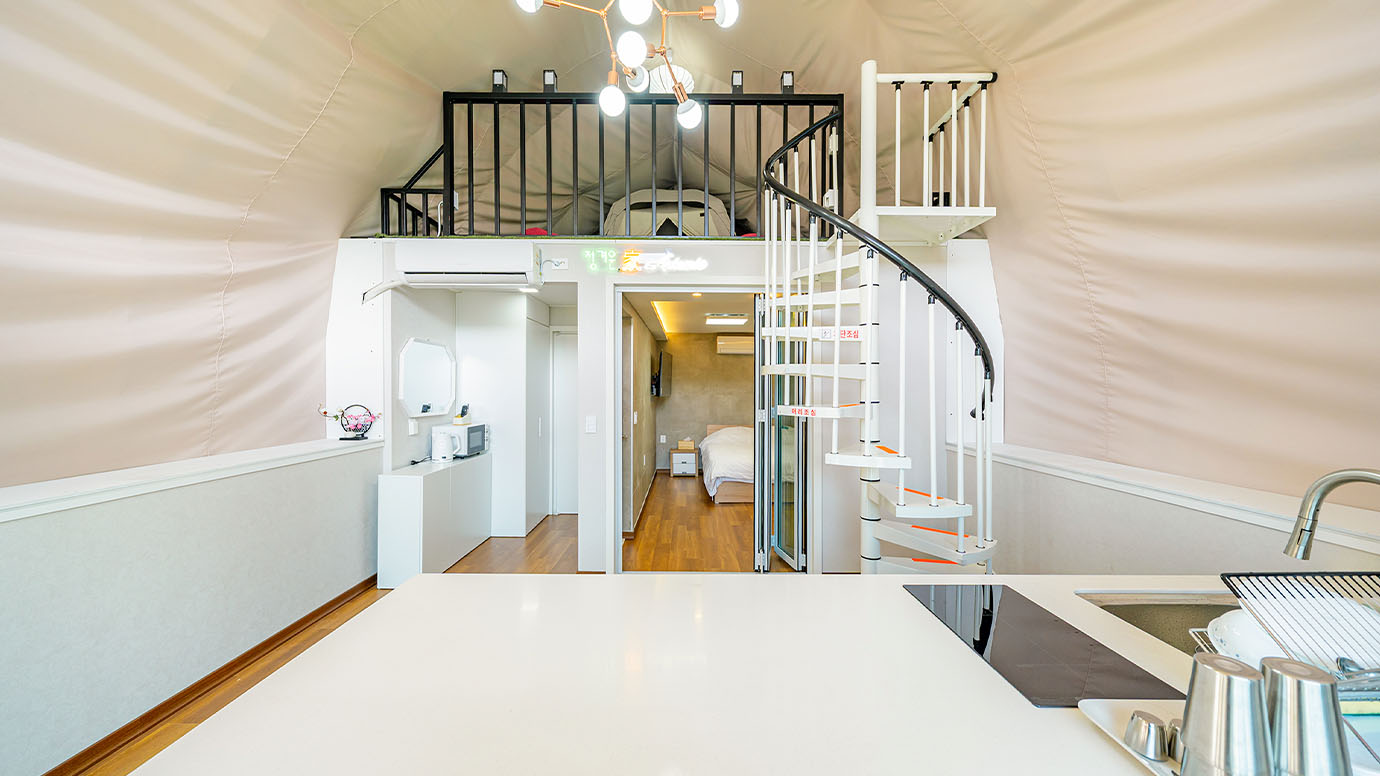 탁 트인 전망 속에서 여유로운 휴식을 즐기는 프리미엄 복층 글램핑 공간입니다.