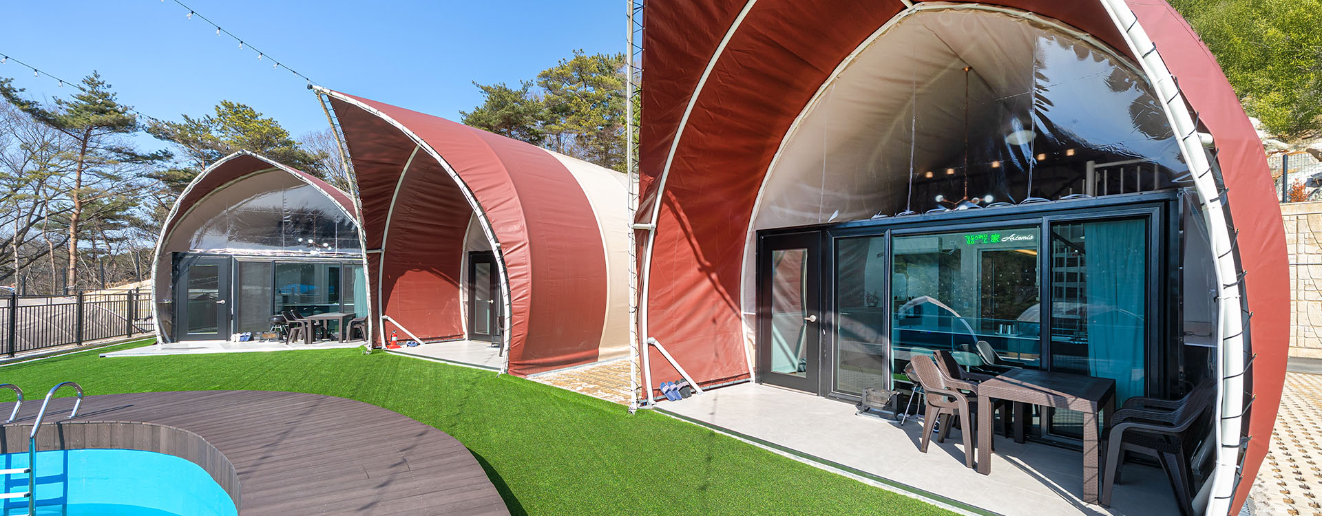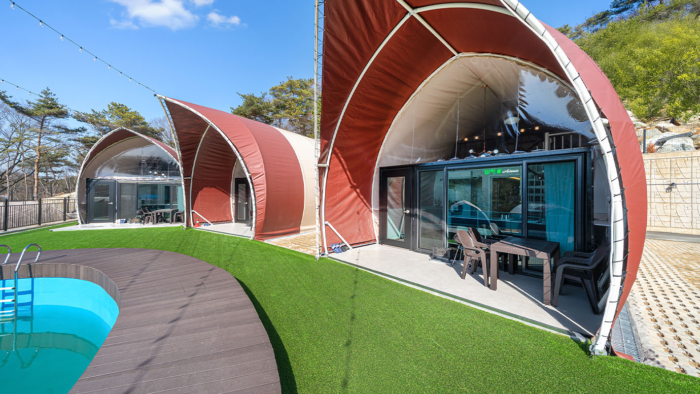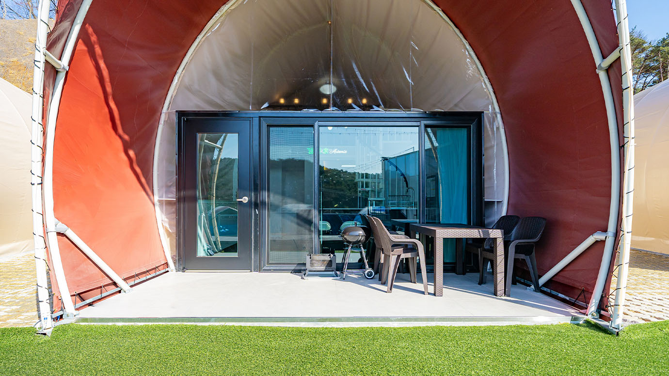 탁 트인 전망 속에서 여유로운 휴식을 즐기는 프리미엄 복층 글램핑 공간입니다.