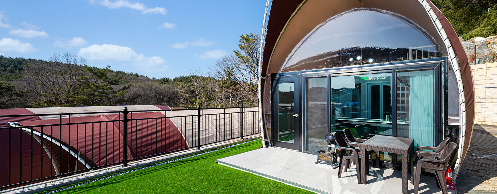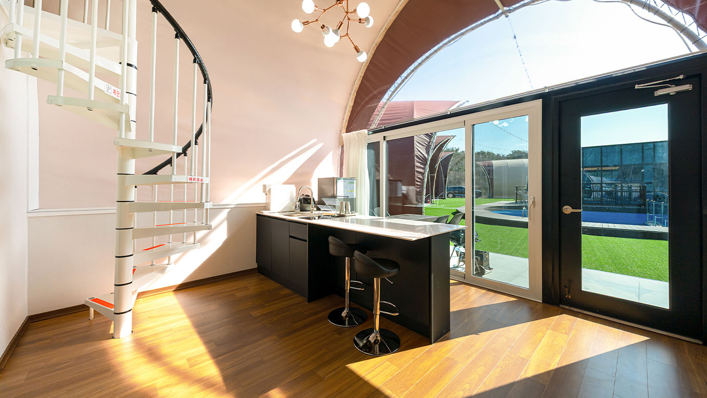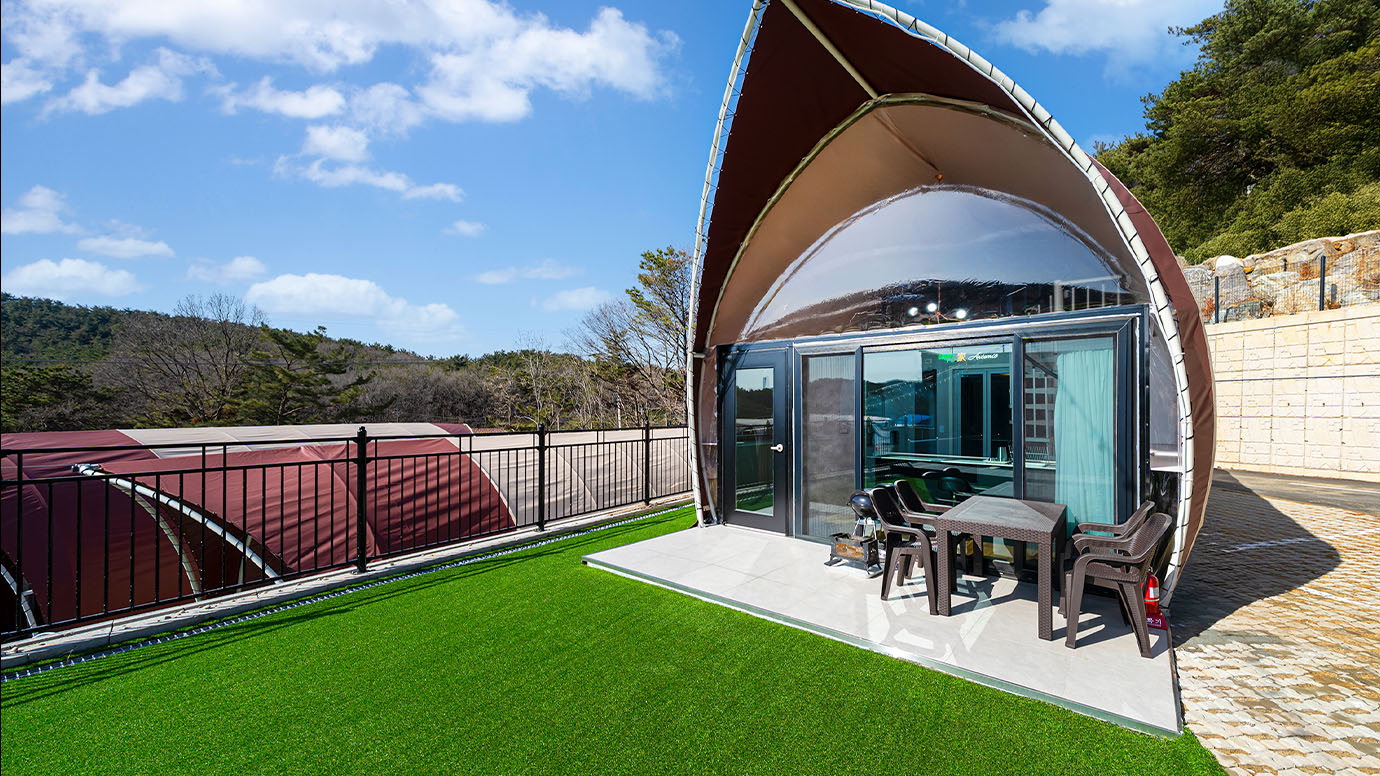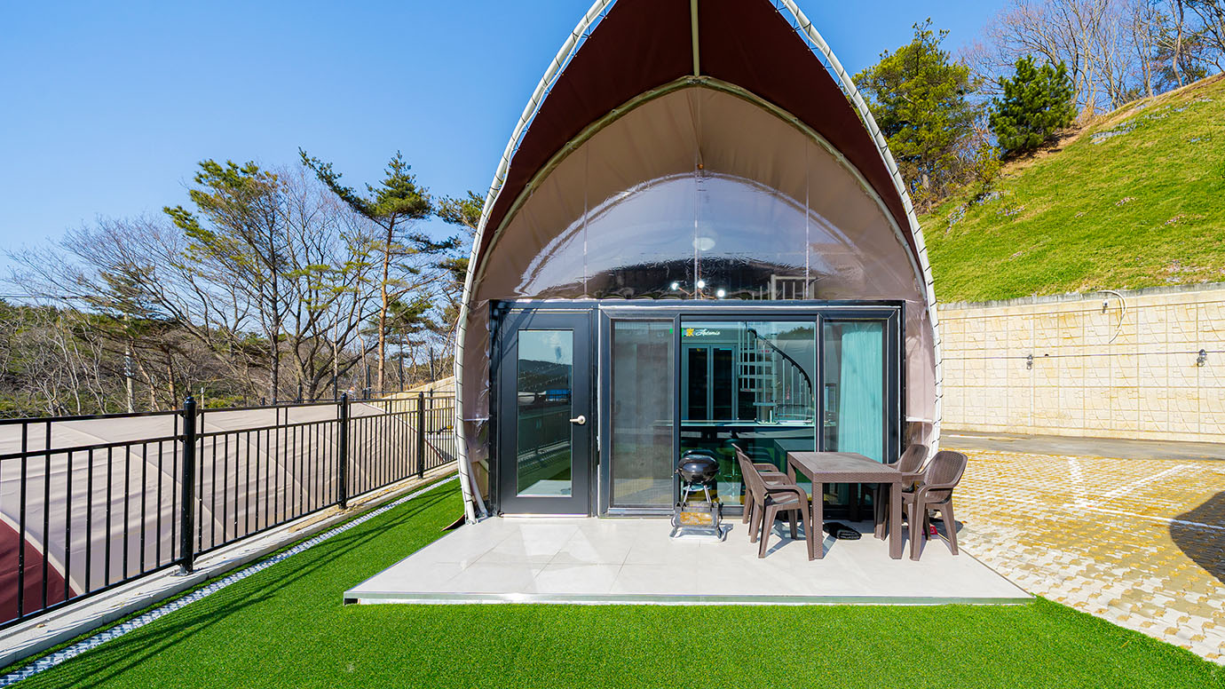 탁 트인 전망 속에서 여유로운 휴식을 즐기는 프리미엄 복층 글램핑 공간입니다.